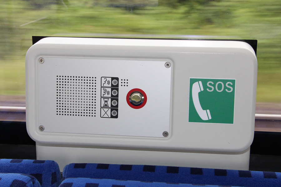 Anforderung der Hilfe (Ausstieg): Anforderungstaster an den Türen zum Mehrzweckbereich für Rollstuhlfahrende innen, Anforderungstaster direkt am Rollstuhlplatz