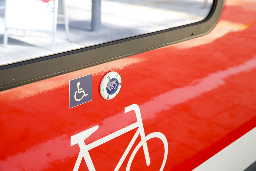 - Anforderung der Hilfe (Einstieg): Anforderungstaster an den Türen zum Mehrzweckbereich für Rollstuhlfahrende (Rollstuhl-Piktogramm außen)