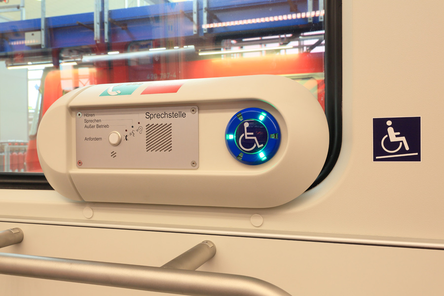 - Anforderung der Hilfe (Ausstieg): Anforderungstaster direkt am Rollstuhlplatz und Anforderungstaster an den Türen zum Mehrzweckbereich für Rollstuhlfahrende
