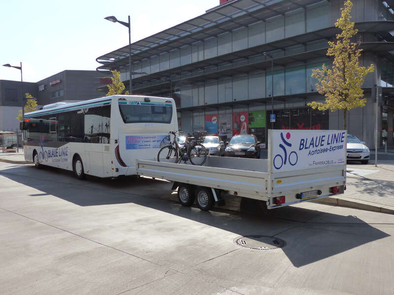 - Eine Fahrradmitnahme auf den Fahrradanhängern der "Blauen Linie" ist nur möglich, sofern dies die Gegebenheiten des Anhängers und die Ladungssicherung zulassen. Dies entscheidet das Betriebspersonal vor Ort. Sonderfahrräder wie z.B. Tandems, Liegefahrräder oder Fatbikes können vom Transport ausgeschlossen werden.