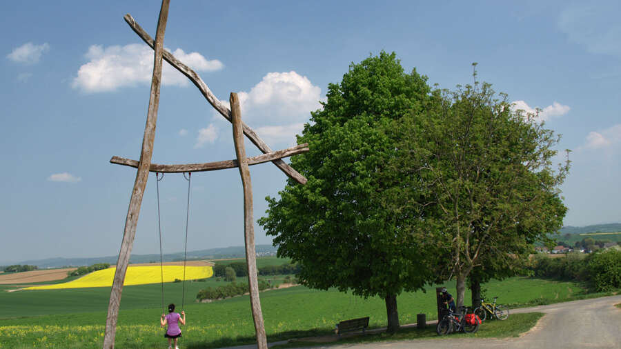 | 19,5 km | Über die Eisenbahngleise geht es vorbei an der Himmelsschaukel, die einen Teil der Regionalpark RheinMain darstellt, zur Marienkapelle in Hirzbach. |