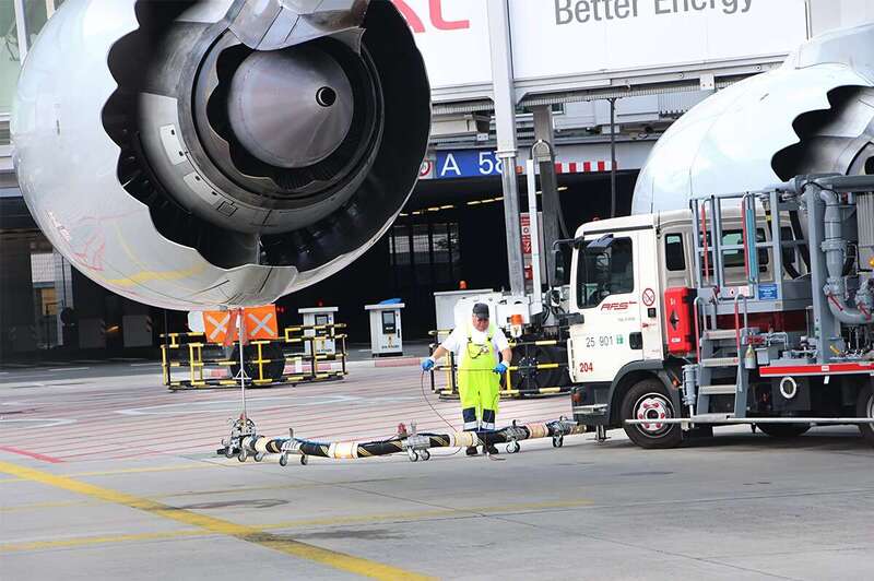 Vor einer gigantischen Turbine stoppt der Bus, damit die Tour-Gäste ein Tankmanöver beobachten können. An der Unterseite der Turbine befestigt ein Techniker zwei beindicke Schläuche. Neben ihm, unter dem Flügel der Maschine, steht ein spezielles Fahrzeug: Dieser sogenannte Dispenser reguliert den Druck, damit der Treibstoff direkt aus dem Tanklager in den Flieger gepumpt werden kann.
