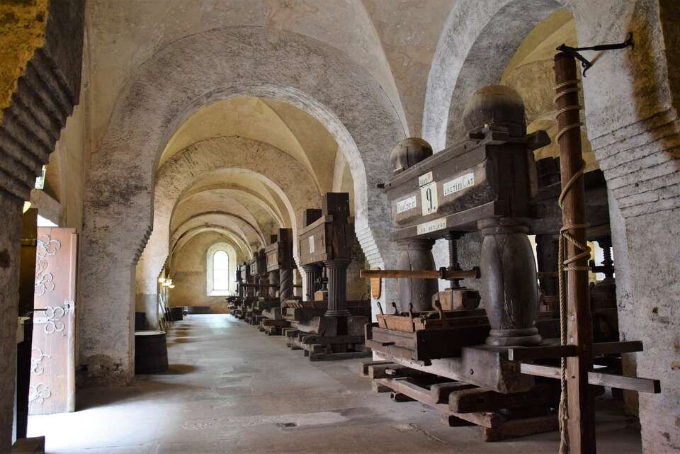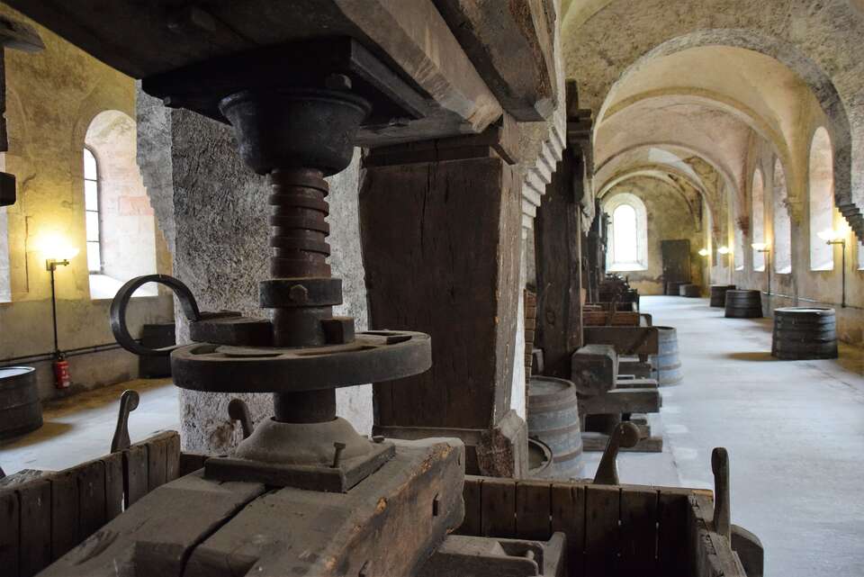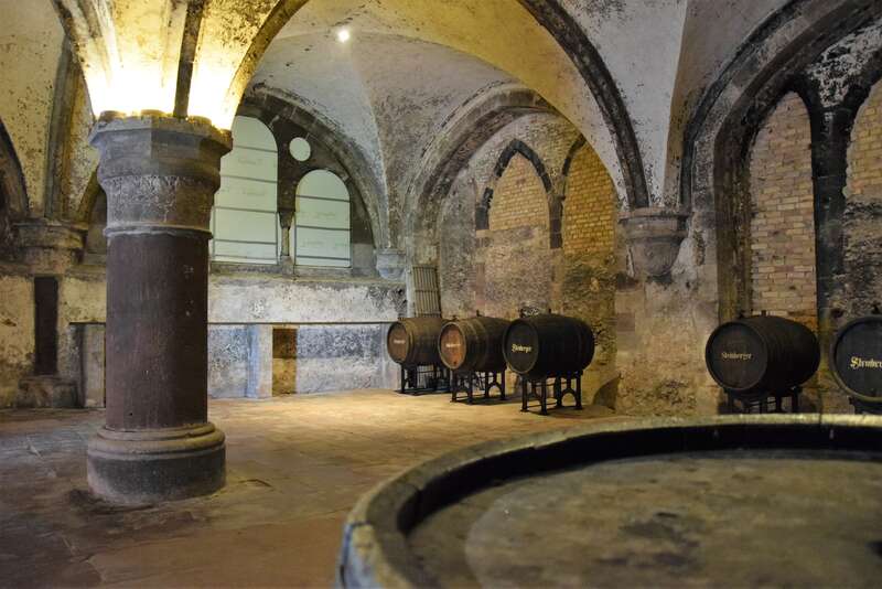 Spärliche, UV-neutrale Beleuchtung, Kreuzgewölbe an der Decke, ein paar alte Holzfässer - mehr braucht es nicht, um sich anschaulich vorstellen zu können, wie hier einst erlesene Weine gelagert wurden. Ursprünglich war der Cabinetkeller ein Brudersaal, in dem die Mönche ihre häuslichen Arbeiten erledigten, später wurde der Raum als Weinkeller genutzt und als "Cabinet" zur Lagerung wertvoller Weine. Im sogenannten Eiskeller gibt es Einblick in die Schatzkammer des Weinguts Kloster Eberbach. Die Tür aus Eisengitter wird heutzutage nur zu besonderen Anlässen geöffnet. Die Flaschen lagern in Metallregalen bis unter die Gewölbedecke, darunter sind viele Raritäten, manche Tropfen sind über 300 Jahre alt.