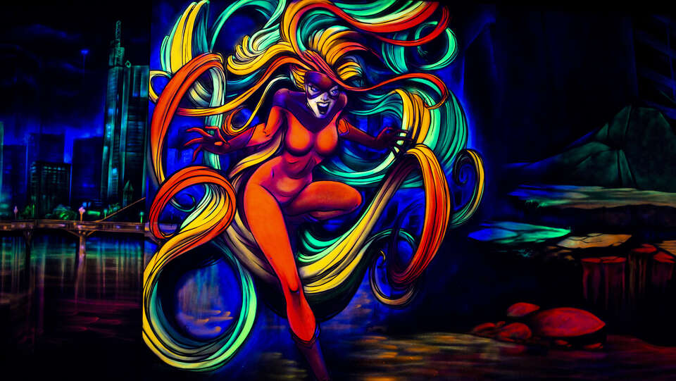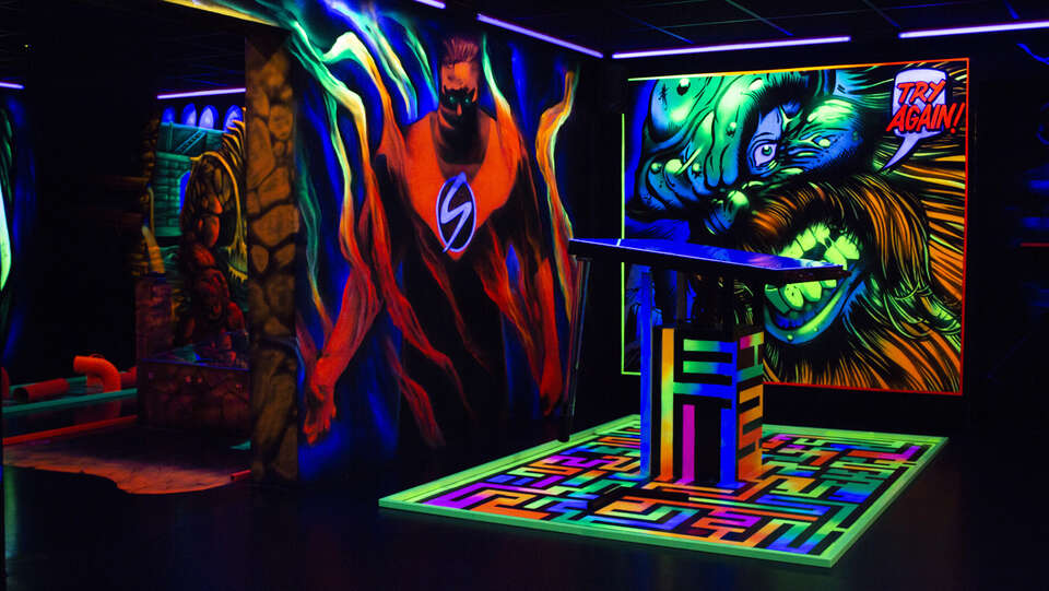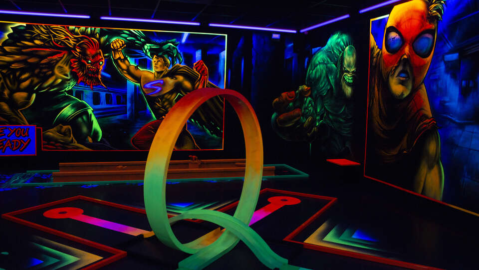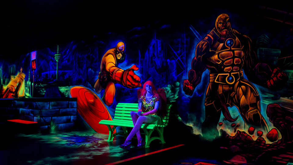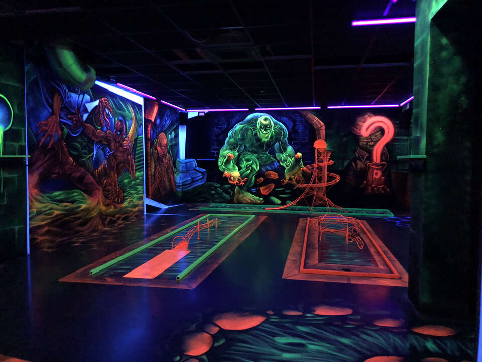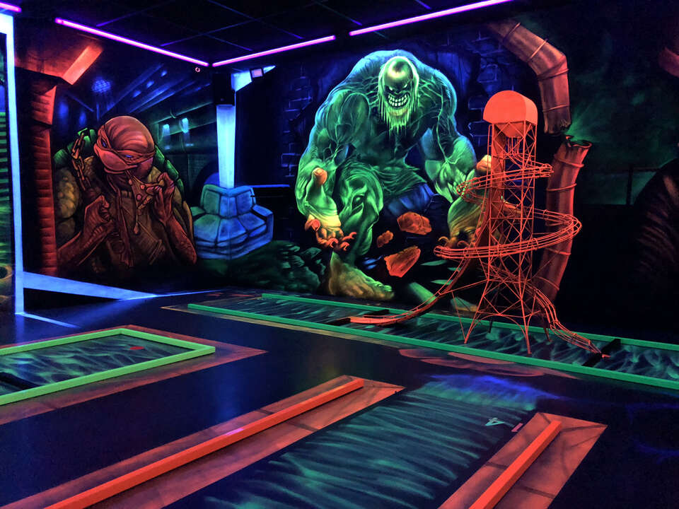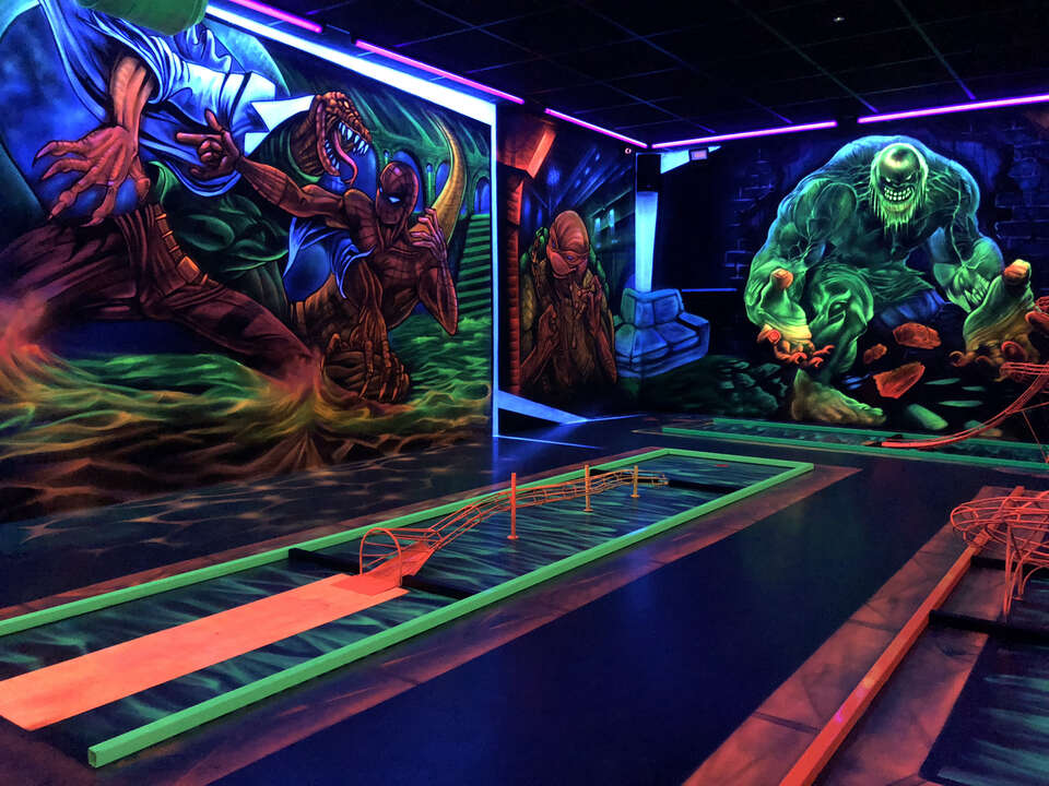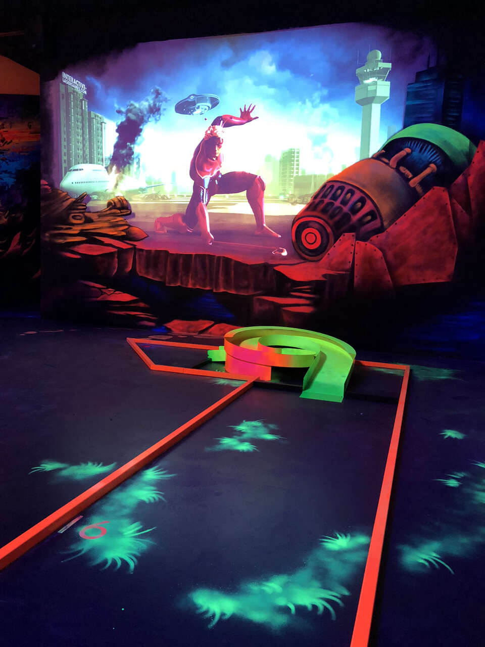 Mit einem leckeren Getränk in der Hand kann es dann losgehen: Nach einer kurzen Einweisung geht es mit 3D-Brille, Golfschläger und einem scheinbar leeren Blatt endlich in die Minigolf-Anlage. Dort kommt man aus dem Staunen kaum heraus: vor einem tut sich eine komplett neonfarbige Erlebniswelt mit ganz besonderen 3D-Effekten auf. Fünf Sprayer haben sich hier zwei Wochen auf 500 m² ausgetobt und aus früheren Jeans- und Friseurläden eine dreidimensionale Superheldenwelt gestaltet. Insgesamt 1546 Dosen wurden für die besondere Spraytechnik benötigt. Die Neonfarben und 65 Schwarzlichtlampen machen das Indoor-Minigolf zu einem einzigartigen Erlebnis.
