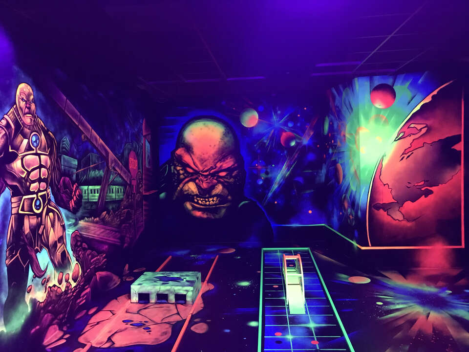 Schon beim Betreten des Eingangsbereiches fühlt man sich in eine andere Welt versetzt: Alles ist kunterbunt, in Neonfarben gehalten – auf schwarzem Hintergrund. Alle Utensilien auf der Theke sind ein Blickfang und machen Lust auf das bevorstehende Spiel: Die Tafel, welche die bisherige Bestleistung ehrt, motiviert, eine neue Höchstleistung aufzustellen. Als Andenken für den Sieg können Neonbändchen und knallige Siegerpokale mitgenommen werden.