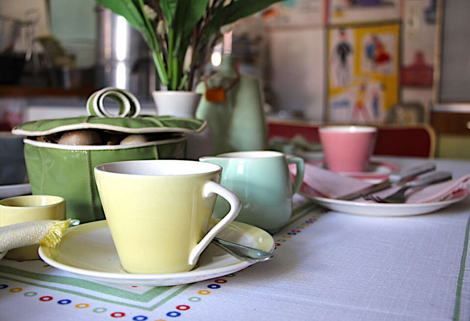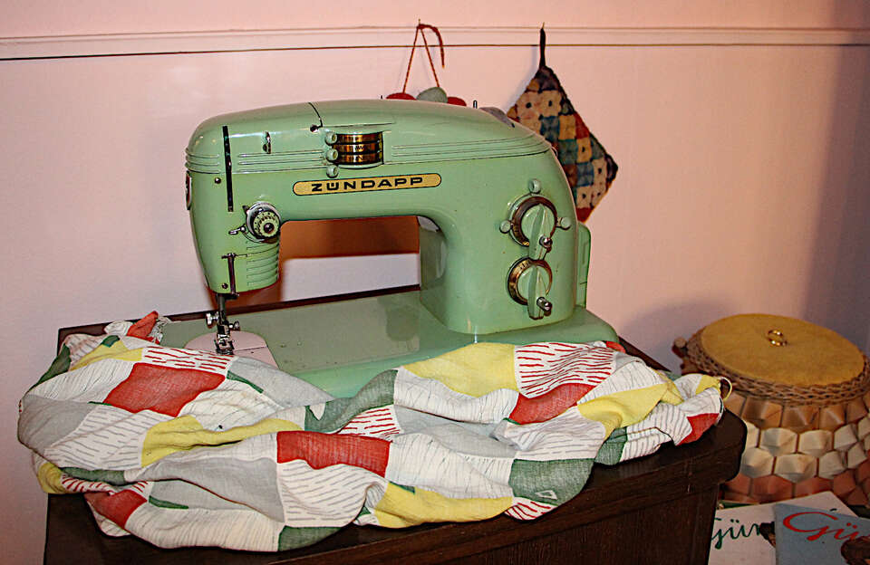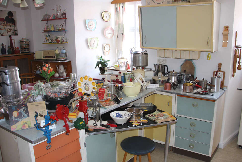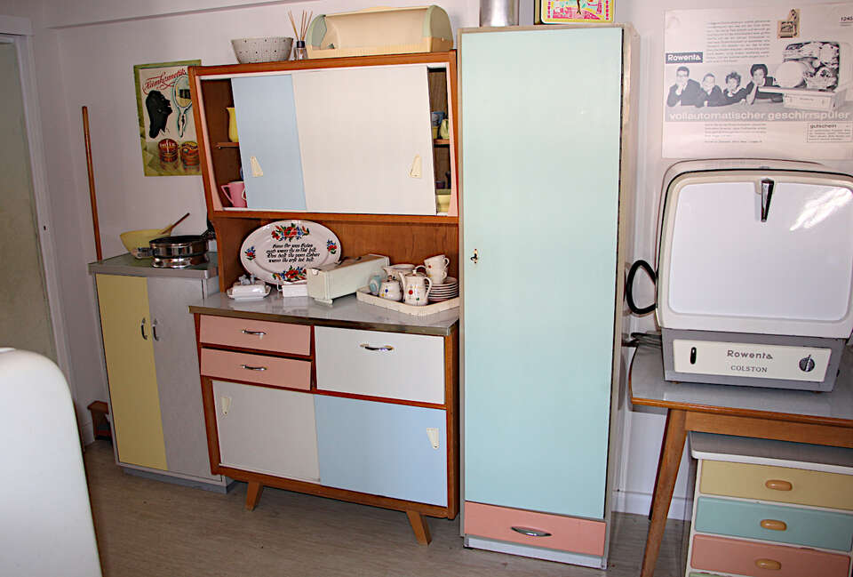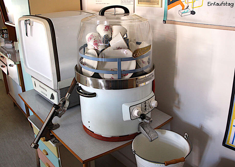 Auch in der Küche hielt ein neuer Lebensstil Einzug: helle Pastellfarben, Küchenmaschinen als Helfer der Hausfrau - bis hin zu den frühen Geschirrspülmaschinen. Schwer vorstellbar, wie das Gerät gerumpelt haben oder wie lange es gelaufen sein muss für ein wenig Geschirr.