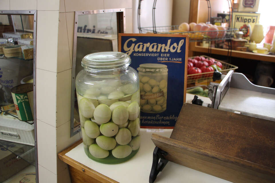 Eindruck hinterlässt ebenso der Tante-Emma-Laden mit einer Sammlung bekannter und auch überraschender Artikel. Erneut kommt "das kenn‘ ich doch" über die Lippen, an der nächsten Vitrine ebenso die Frage "Was ist das denn? Sind das Soleier?" Von wegen. Leicht ungläubig dürfte das eine oder andere Gesicht dreinschauen. Eingelegte rohe Eier, um sie bis zu einem Jahr haltbar zu machen? Auch das gab es, Einschränkung inklusive: Für die Weiterverarbeitung eigneten sie sich nur noch fürs Backen und Kochen.