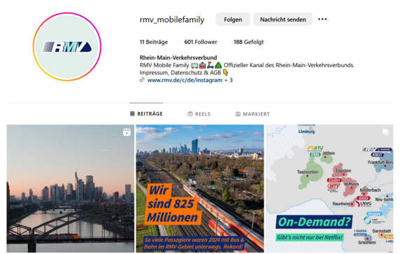 Das Social-Media-Team besteht aus Christoph, Dörte, Marco, Matthias und Thekla. Ausgestattet mit fachlichem Know-how rund um digitale Kommunikation und den ÖPNV stehen wir Ihnen auf Instagram (@rmv_mobilefamily) und Facebook (@Rhein-Main-Verkehrsverbund) mit Rat und Tat zur Seite und versorgen Sie in Sachen ÖPNV auch immer mit Neuigkeiten.