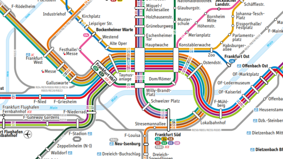 Hier finden Sie den Schnellbahnplan und Schienennetzplan für einen RMV-weiten Überblick. Außerdem können Sie die lokalen Liniennetzpläne für Frankfurt abrufen.