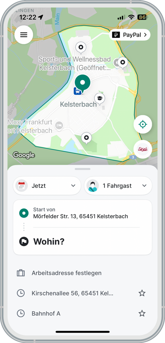 Die Bezahlung Ihrer Fahrt erfolgt bargeldlos – zum Beispiel per Kreditkarte, PayPal oder, je nach Anbieter, auch direkt im Fahrzeug. Ihr bevorzugtes Zahlungsmittel wählen Sie bequem in der App OnDemand@RMV aus. Vor der Buchung wird Ihnen der Fahrpreis in der App angezeigt.