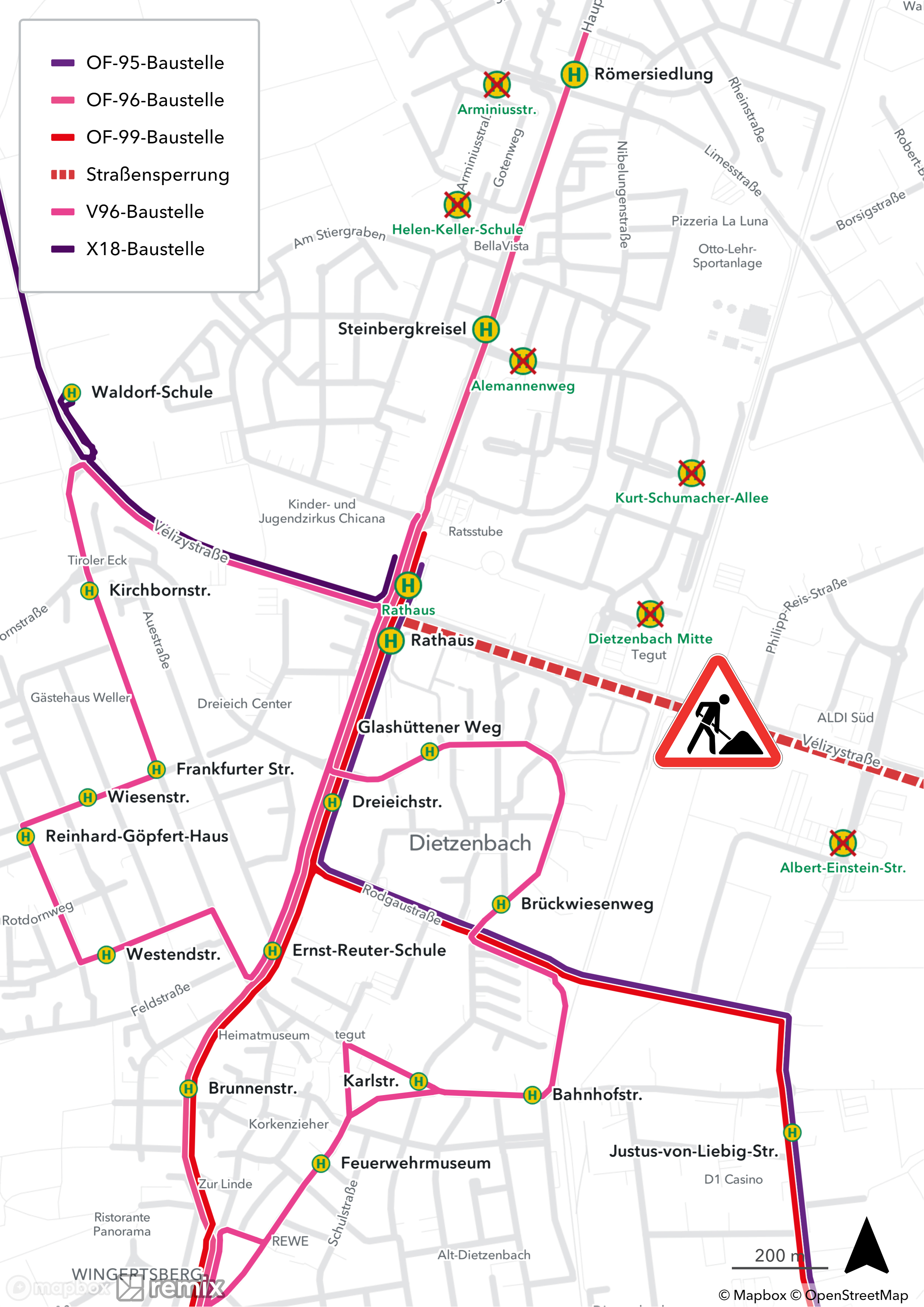 Umleitungen und Haltestellenentfall auf den Linien X18, OF-95, OF-96, OF-99 und V96