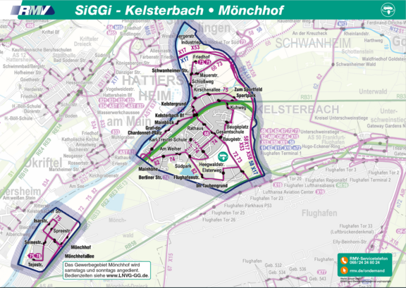 SiGGi verkehrt montags bis freitags im Stadtgebiet von Kelsterbach, jedoch nicht im Gewerbegebiet Airparc Logistic (Mönchhofgelände). Samstags, sonn- und feiertags zählt das Gewerbegebiet Airparc Logistic ebenfalls zum Bediengebiet.