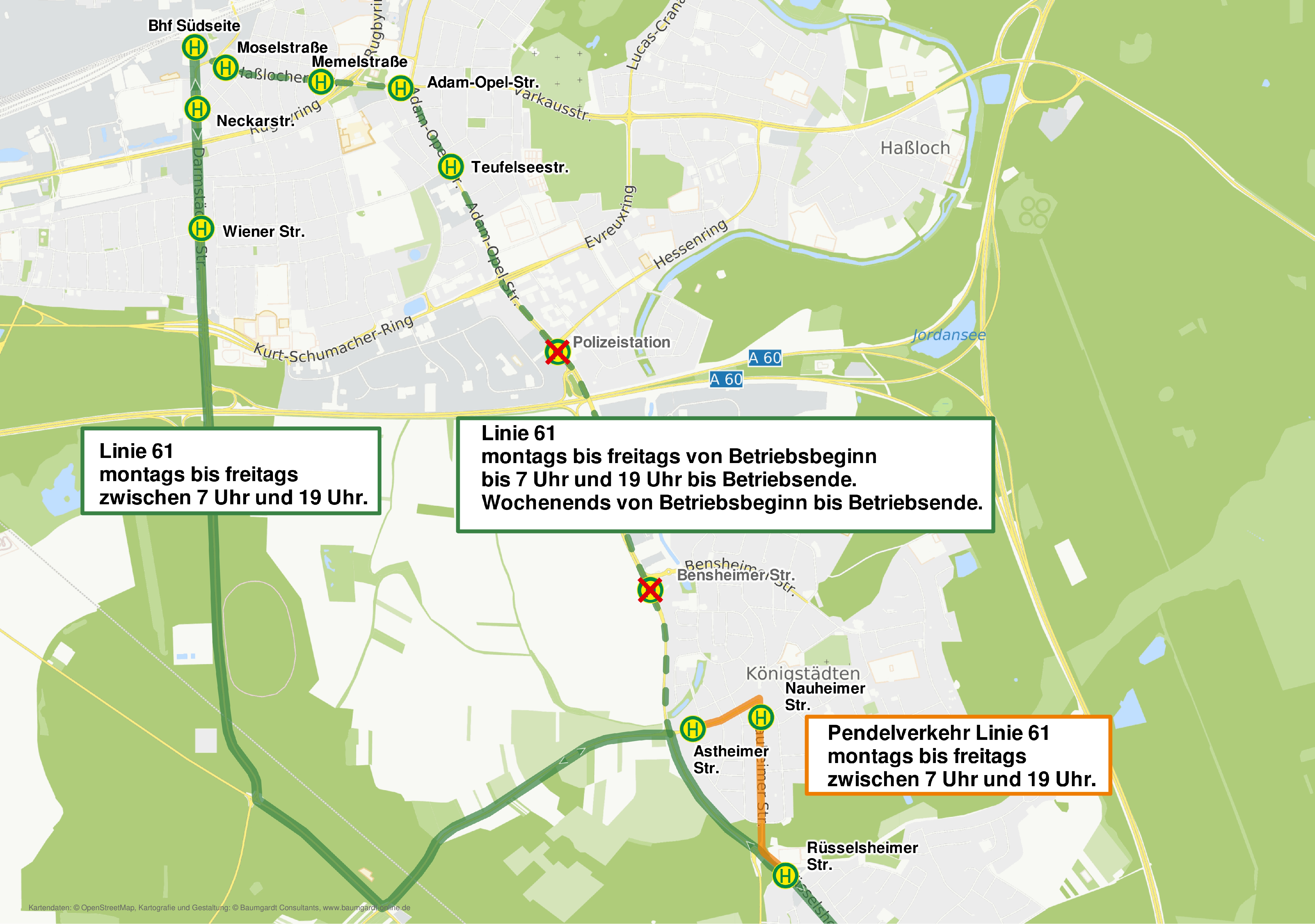 In Königstädten entfallen die Haltestellen "Nauheimer Straße" und "Astheimer Straße". Zwischen diesen beiden Haltestellen und der Haltestelle "Rüsselsheimer Straße" wird ein Pendelverkehr eingerichtet, der als Linie 61 verkehrt. Außerhalb des oben genannten Zeitraums, also auch samstags und sonntags, verkehrt die Linie 61 regulär.