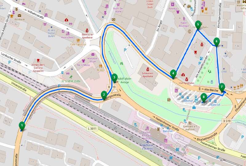 Achtung Ausnahme: Nur die Fahrten um 5.15 Uhr ab "Wildsachsen Parkstraße", die S-Fahrt um 6.58 Uhr ab "Wildsachsen Parkstraße" und die S-Fahrt um 7.08 Uhr ab "Langenhain Siedlung" fahren den Hofheimer Bahnhof über eine Sonderumleitung an. Sie halten an der Haltestelle "Seniorenresidenz" und folgen dann dieser Route: Cohausenstraße, Am alten Bach, Am Untertor, Kirschgartenstraße. Die Haltestelle "Rheingaubrücke" entfällt während dieser Fahrten.