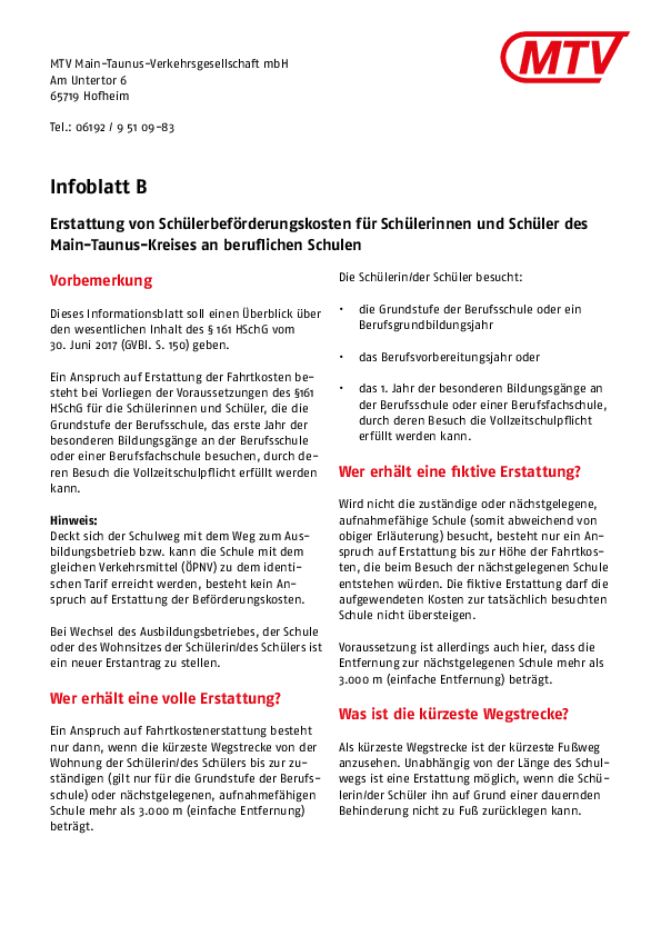 Bei Fragen zum Thema „Fahrtkostenerstattung“ hilft Ihnen das Erstattungsteam der Main-Taunus-Verkehrsgesellschaft gerne weiter unter 06192 951 09 83 oder per Mail unter erstattung@mtv-web.de.