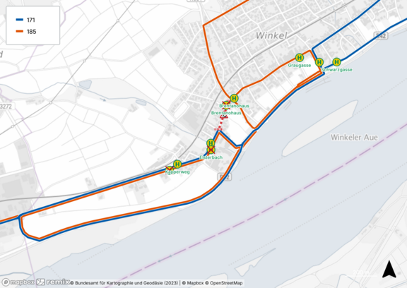 Aufgrund von Bauarbeiten kommt es im Stadtteil Winkel vom 13.-19.10.2025 zu Beeinträchtigungen. Die Linien fahren eine innerörtliche Umleitung.