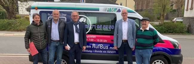 Landkreis Limburg-Weilburg (von links): Verkehrsplaner Markus Rinnert von der VLDW, VLDW-Geschäftsführer Dirk Plate, Landrat und VLDW-Aufsichtsratsvorsitzender Michael Köberle, der Beselicher Bürgermeister Michael Franz und Rufbus-Fahrer Ivo Stane