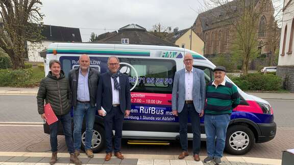 (von links): Verkehrsplaner Markus Rinnert von der VLDW, VLDW-Geschäftsführer Dirk Plate, Landrat und VLDW-Aufsichtsratsvorsitzender Michael Köberle, der Beselicher Bürgermeister Michael Franz und Rufbus-Fahrer Ivo Stane.