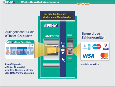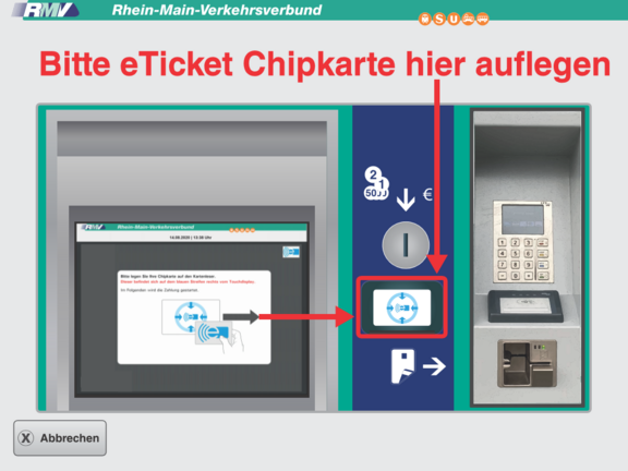 Alle RMV-Fahrkartenautomaten sind mit einem separaten eTicket-Lese- und Schreibterminal ausgestattet. Die Chipkarte muss so nur einmal auf das Terminal aufgelegt werden und bleibt dort, bis der Kaufvorgang und die Übertragung des eTickets auf die Chipkarte abgeschlossen sind.