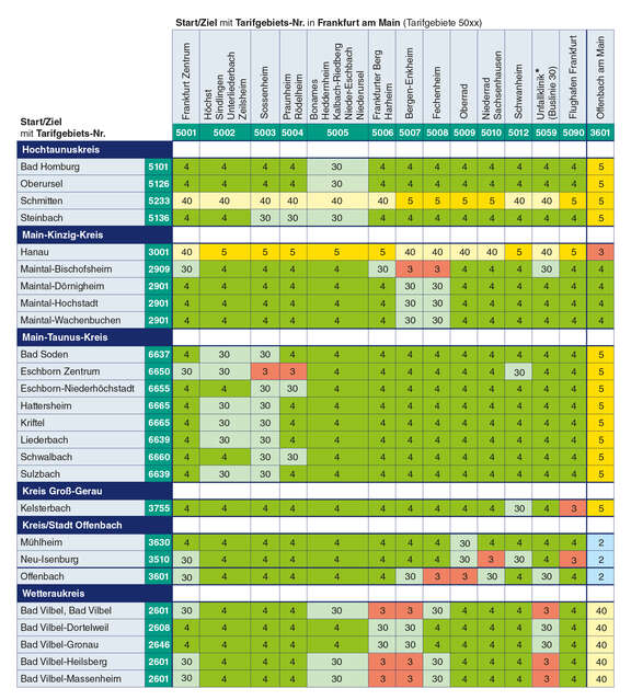 Die Preisstufen in schwarzer, fetter Schrift zeigen dabei die vergünstigten Verbindungen an, bei eingeschränkter räumlicher Gültigkeit im Tarifgebiet 5000 Frankfurt am Main.