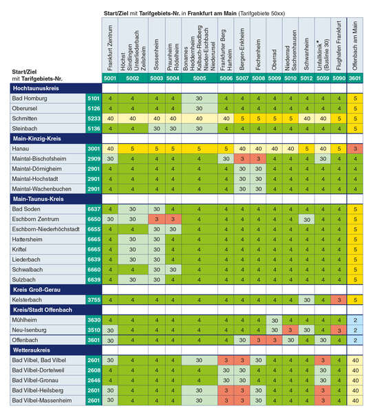 Die Preisstufen 30 und 40 gelten für Fahrten zwischen folgenden Städten bzw. Gemeinden im Umland, meist noch differenziert nach einzelnen Ortsteilen, und Frankfurt: