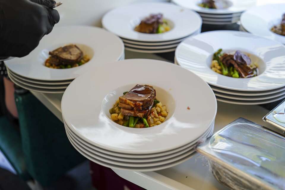 - Während der 90-minütigen Rundfahrt gab es ein Drei-Gänge-Menü, kreiert von zwei Köchen. Erster Gang: Grüne-Soße-Törtchen mit Spessartforelle aus dem Rauch, dazu eingeweckte Knoblauchsrauke aus dem Vilbeler Wald. Hauptgang: Geschmortes vom Höhenvieh mit Senfperlen und lila Kartoffelchips, mit Feldgemüse und Wetterauer Kartoffelnage. Zum Dessert erfreute Hessische Apfeltarte mit Schmandmousse und gehobelter schwarzer Nuss die Gaumen.