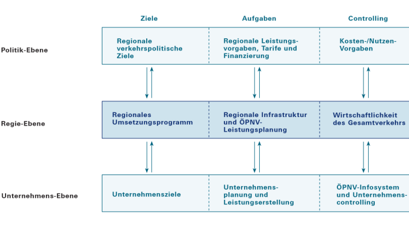 Der Nahverkehr in Hessen wird von drei Säulen getragen: Der Politik-Ebene, der Regie-Ebene, auf der die hessischen Verkehrsverbünde tätig sind und der Unternehmens-Ebene, auf der die Verkehrsleistungen im Auftrag der Verkehrsverbünde erbracht werden.