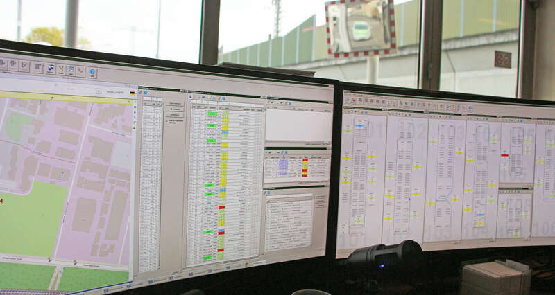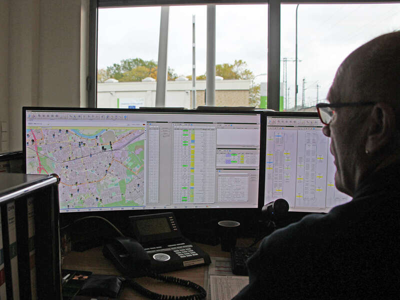 Auf großen Computermonitoren, die im Halbkreis angeordnet sind, überwacht Stefan Knoblauch den städtischen Busverkehr. Auf einem ist ein Ausschnitt des Offenbacher Straßennetzes sowie die aktuelle Position der Busse, auf einem anderen sind alle Busse zu sehen, die gerade unterwegs sind. Die Linie 101 in Richtung Rumpenheim Schlosspark (Wagen Nr. 96, Umlauf Nummer 6) befindet sich beispielsweise an der Waldschule mit zweieinhalb Minuten Verspätung.
