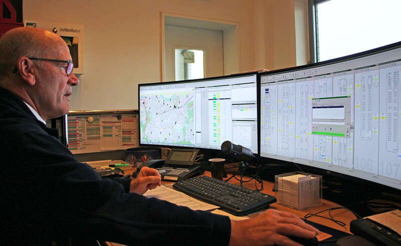 Neben Monitoren stehen an den Arbeitsplätzen auch Telefone und Funkgeräte, mit denen der Verkehrsmeister Kontakt zu jedem Bus aufnehmen kann. Umgekehrt können sich die Fahrer aller Busse auch jederzeit in der Leitstelle melden, wenn sie Fragen haben.